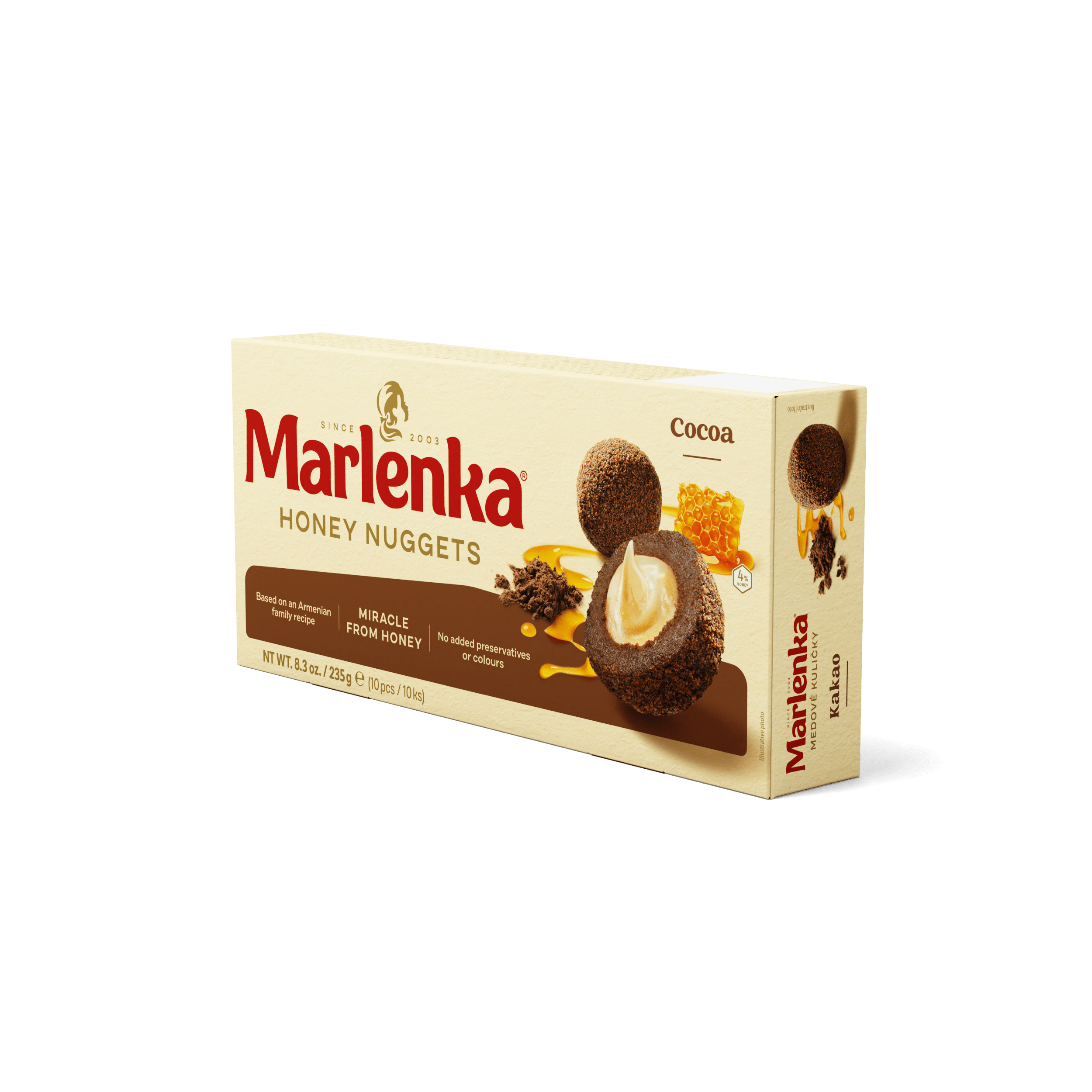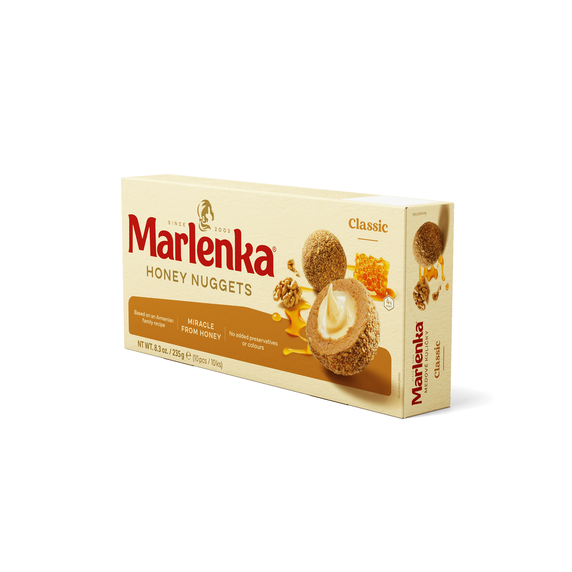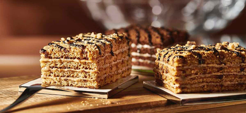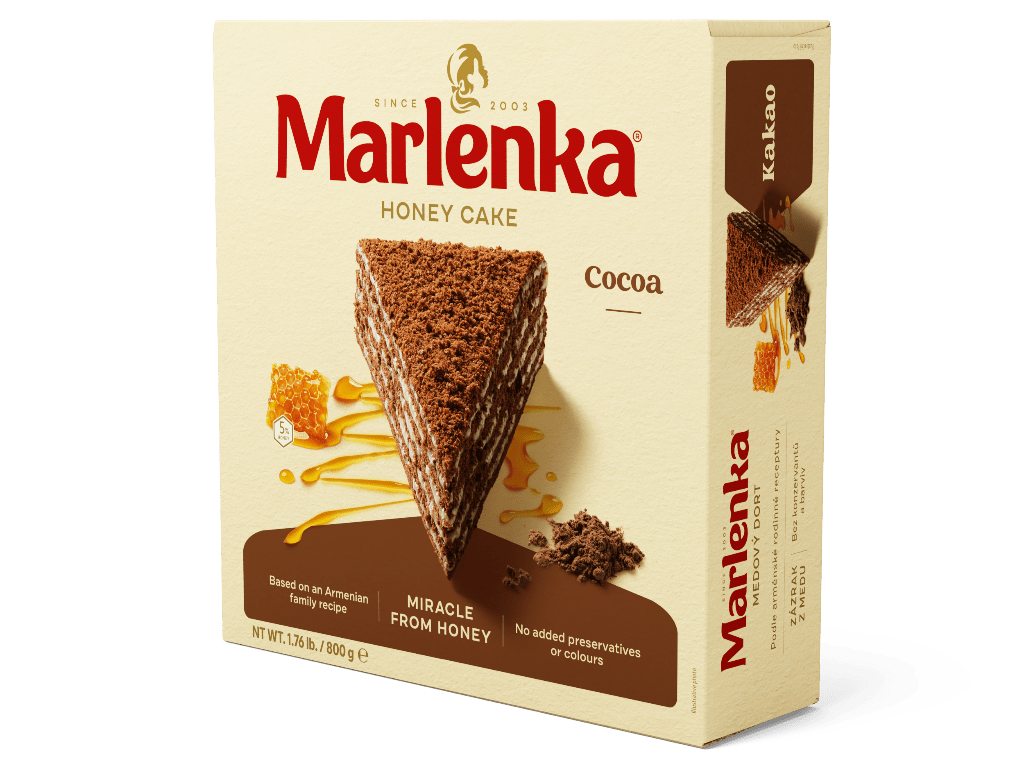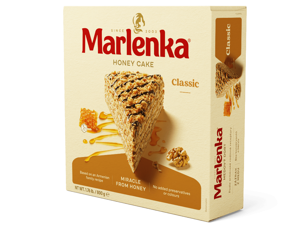 MARLENKA® is a traditional honey cake with nuts, made according to an old Armenian family recipe. The secret manufacturing procedure enable us to combine the honey and milk mixture to create this multi-layered honey delicacy. The top is drizzled with chocolate icing and sprinkled with chopped walnuts. This version is Gluten-Free.